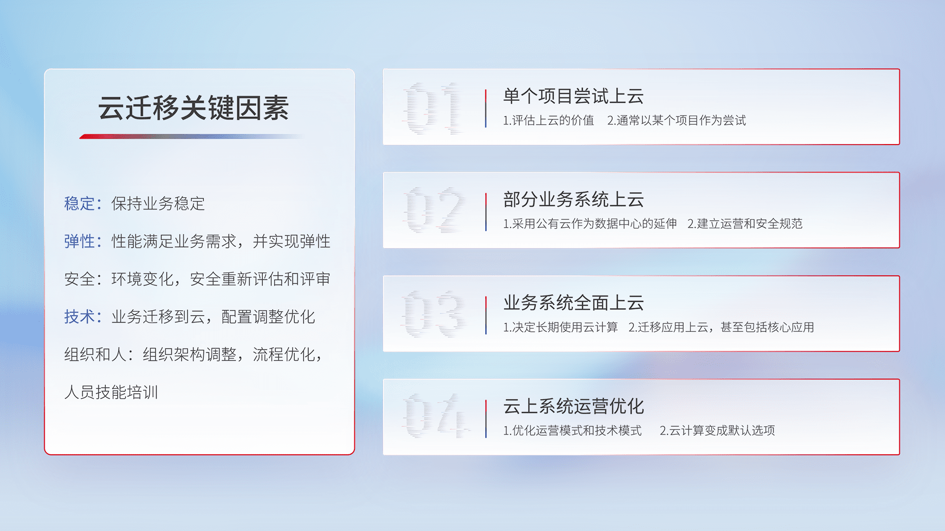 结合实际业务,,,从规划设计、、、、云平台选型、、、、云原生改造、、、数据迁移、、、、集成交付,,迁移全过程为客户识别最佳上云路径,,做好风险识别管理,,,设计网络架构、、、、身份权限、、、、安全审计合规、、操作审计、、、、日志审计、、监控告警策略、、多站点容灾设计等,,对云上基础设施进行整体规划,,,提升IT治理水平,,,,以满足弹性、、、高可用、、、高性能的需求。。