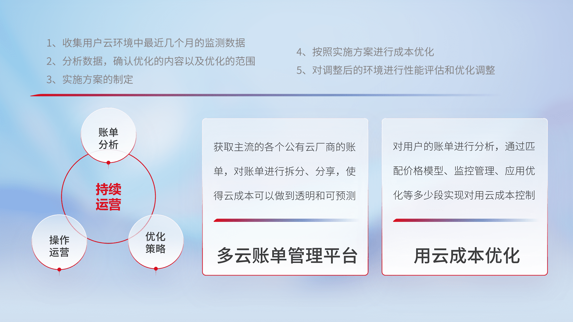 通过多云纳管,,,以统一的资源数据模型把客户的云资源进行抽象和封装,,,进而实现对多云资源的统一操作,,,,保障云资源管理的可靠性、、、稳定性与可用性。。量身定制化运维内容,,,配置、、、开发运维、、、、补丁管理、、、、备份、、监控、、、、认证和访问管理、、、审计和日常巡检等,,保障在用云过程中的可靠度,,,稳定度以及高可用率。。
